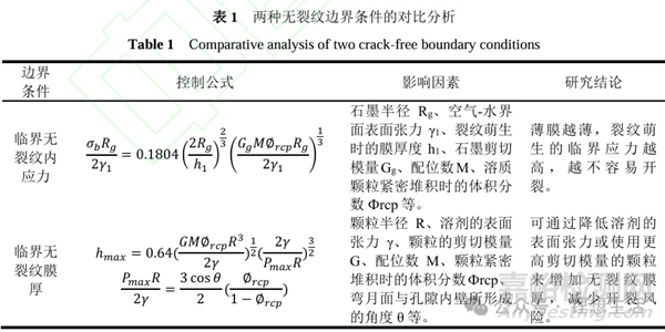 為了深入分析這種開裂缺陷,研究者們提出了臨界無裂紋內(nèi)應(yīng)力和臨界無裂紋膜厚兩種邊界條件,旨在為鋰離子電池?zé)o裂紋極片的制造提供理論指導(dǎo)。 在鋰離子電池正負(fù)極極片的干燥過程中,溶劑的蒸發(fā)和毛細(xì)作用都會在極片內(nèi)部引發(fā)應(yīng)力,當(dāng)這種應(yīng)力超過某一臨界值時,極片涂層便形成裂紋以緩解壓力,該臨界值就是臨界無裂紋內(nèi)應(yīng)力。而臨界無裂紋膜厚是指在涂覆過程中,涂層能夠保持無裂紋狀態(tài)的最大厚度,一旦超過這個厚度,涂層在干燥過程中由于內(nèi)部應(yīng)力過大而易于產(chǎn)生裂紋。該厚度受涂層材料特性、溶劑揮發(fā)速率、干燥條件以及基材性質(zhì)等多因素共同影響。