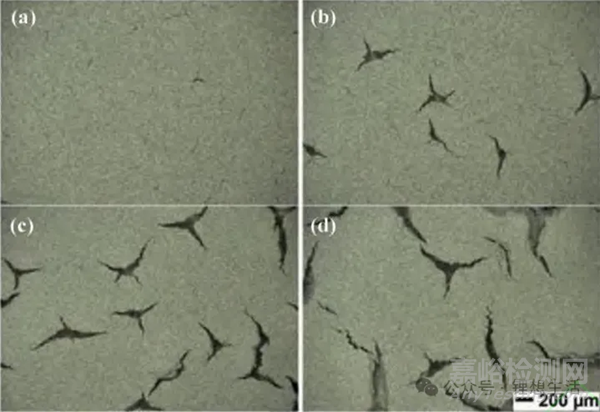圖3 表面質(zhì)量負(fù)載量為(a)15.0 mg/cm2、(b)17.5 mg/cm2、(c)20.0 mg/cm2和(d)25.0 mg/cm2的水處理 NMC陰極的光學(xué)顯微鏡圖像