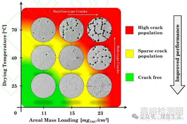 圖4 極片裂紋與干燥溫度和面密度載量的關(guān)系圖