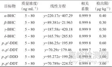 取8種農(nóng)藥系列混合校準(zhǔn)溶液和樣品溶液各1 μL,注入氣相色譜儀中,按照1.2色譜條件分別進(jìn)行測定,以目標(biāo)物的質(zhì)量濃度為橫坐標(biāo),以對應(yīng)的色譜峰面積為縱坐標(biāo),進(jìn)行線性回歸,得各農(nóng)藥線性方程。樣品溶液中如檢出與相應(yīng)農(nóng)藥保留時(shí)間相一致的色譜峰,則取對應(yīng)質(zhì)量濃度的有機(jī)氯農(nóng)藥校準(zhǔn)溶液,按外標(biāo)法計(jì)算其含量。