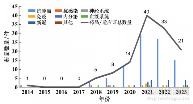 ▲圖3-2014-2023年我國(guó)附條件批準(zhǔn)上市品種/適應(yīng)證的種類分布