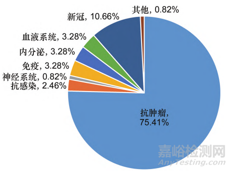 自2024年我國(guó)第1件附條件批準(zhǔn)藥品西達(dá)本胺片上市以來(lái),2014-2023年間共有122件藥品(品種/適應(yīng)證) 附條件批準(zhǔn)上市,其中35件為新增適應(yīng)證。2015-2017 年間無(wú)藥品附條件批準(zhǔn)上市,2018-2021年間附條件批準(zhǔn)上市藥品數(shù)量持續(xù)增長(zhǎng),2022-2023年間數(shù)量減少( 見(jiàn)圖2)。根據(jù)2023年度藥品審評(píng)報(bào)告,已有 19個(gè)品種轉(zhuǎn)為完全批準(zhǔn)[7]。在適應(yīng)證分布上,抗腫瘤藥物占比最高(75.41% ),其次為新冠疫苗和治療藥物(10.66% ),見(jiàn)圖3。