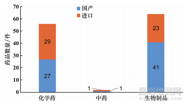 在品種類別上, 主要為生物制品 (64件, 占52.46% ),其次為化學(xué)藥(56 件,占45.90% ),中藥僅淫羊藿素軟膠囊(國(guó)產(chǎn)) 和香雷糖足膏(進(jìn)口)2項(xiàng)。同時(shí),國(guó)產(chǎn)藥品占比(69件,占56.56% ) 高于進(jìn)口藥品(53件,占 43.44% ),見(jiàn)圖4。