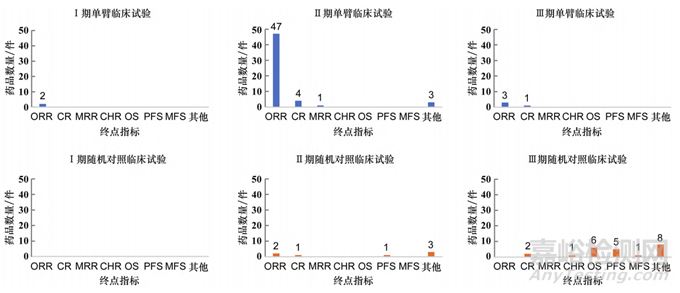 終點(diǎn)指標(biāo)的選擇,ORR:客觀緩解率,CR:完全緩解,MRR:主要緩解率,CHR:血液完全緩解,OS:總生存期,PFS:無(wú)進(jìn)展生存期,MFS:無(wú)轉(zhuǎn)移生存期,8:其他(包括基線的血清磷濃度、3年無(wú)事件生存期率、主要細(xì)胞遺傳學(xué)反應(yīng)或主要血液學(xué)反應(yīng)等14項(xiàng))