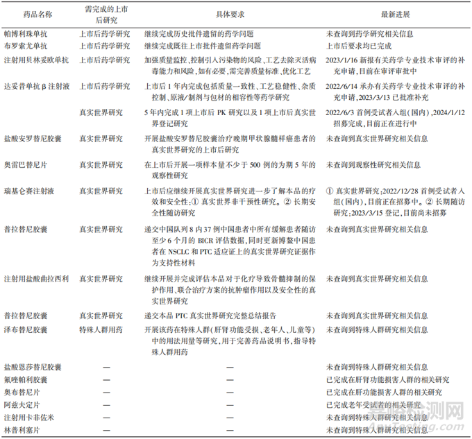 確證性臨床試驗(yàn)是藥品附條件批準(zhǔn)上市后研究的主要內(nèi)容,其中部分進(jìn)口藥品除要求遞交全球確證性臨床研究外,還要求在中國(guó)開展或納入合適比例的中國(guó)受試者上市后臨床研究,以優(yōu)化中國(guó)患者的給藥劑量或給藥方案。在2020-2022年附條件批準(zhǔn)上市藥品中,上市前確證性臨床試驗(yàn)的進(jìn)度不同,據(jù)此制定的上市后臨床研究計(jì)劃也存在差異。① 部分藥品上市前未進(jìn)行確證性臨床試驗(yàn),需要啟動(dòng)新的臨床試驗(yàn)。如替雷利珠單抗注射液上市后要求包括進(jìn)一步細(xì)化并完善上市后確證性Ⅲ期臨床研究方案,在批準(zhǔn)上市后1年內(nèi)啟動(dòng)Ⅲ期臨床研究,并在5年內(nèi)完成[8]。② 部分藥品上市前已進(jìn)行階段性研究,可繼續(xù)正在進(jìn)行的臨床試驗(yàn)。如甲磺酸奧美替尼片上市后要求包括按計(jì)劃完成正在進(jìn)行的Ⅲ期臨床試驗(yàn)確證性隨機(jī)對(duì)照研究,按年度報(bào)告進(jìn)展,完成的研究及時(shí)提交完整的總結(jié)報(bào)告[9]。