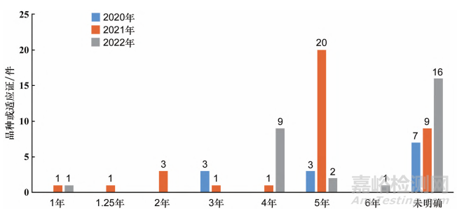 2020-2022年附條件批準(zhǔn)上市藥品中僅2項(xiàng)明確藥品注冊(cè)證書有效期,分別為奧雷巴替尼片3年和注射用卡非佐米5年。明確上市后臨床試驗(yàn)時(shí)間期限的品種/ 適應(yīng)證有46 項(xiàng) ( 占比58.97% ), 期限范圍為1~6年,見(jiàn)圖6。同時(shí),未明確期限的品種/ 適應(yīng)證中3項(xiàng)要求按年度提交報(bào)告,有1項(xiàng)提出在獲批后6個(gè)月內(nèi)與藥審中心溝通該研究的具體方案,4項(xiàng)提出在不晚于上市后第3年與藥審中心溝通臨床試驗(yàn)進(jìn)展,1項(xiàng)不晚于5年。