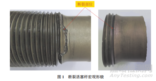 斷裂活塞桿宏觀形貌如圖1所示。由圖1可知:活塞桿已完全斷裂,斷裂位置為活塞桿十字頭端,裂口位于活塞桿螺紋末端收紋和過渡處。此前該壓縮機一級活塞端蓋和隔環(huán)曾發(fā)生開裂現(xiàn)象,并且導致壓縮機一級氣缸或中體下沉,氣缸與中體同軸度偏離。