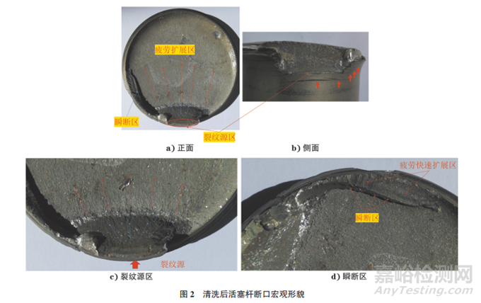 從斷口宏觀形貌看,斷口沒有受到?jīng)_擊變形,保持了原始斷裂形貌。清洗前斷口表面覆蓋較薄的氧化物和腐蝕產(chǎn)物,用煤油浸泡后再用丙酮和乙醇溶液清洗,可去除表面垢物,說明斷口表面垢物形成時間不長。清洗后活塞桿斷口宏觀形貌如圖2所示。由圖2可知:斷口總體平整光滑,沒有明顯的塑性變形和剪切唇;斷裂起源于活塞桿外表面的周向裂紋,裂紋源附近還有多條與其平行的周向裂紋;裂紋源區(qū)域已被碾壓至光滑發(fā)亮,且斷口存在明顯的以裂紋源為原點的放射狀條紋;裂紋擴展區(qū)分為兩個斷裂面,裂紋首先沿45°擴展,然后沿垂直于活塞桿軸線的平面擴展,最后在瞬斷區(qū)斷裂,瞬斷面積較小。