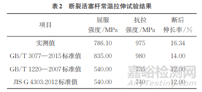 說明該活塞桿材料的強度雖然略低于標準要求,但不是導致活塞桿快速斷裂的主要原因;斷后伸長率符合標準要求。