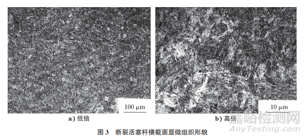 在斷裂活塞桿橫截面取樣,將試樣置于光學顯微鏡下觀察,結(jié)果如圖3所示。由圖3可知:活塞桿材料的顯微組織為具有馬氏體位向的回火索氏體,但局部存在塊狀鐵素體和滲碳體,這可能是導致沖擊吸收能量低于標準值的原因。