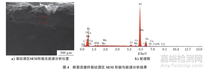 在裂紋源區(qū)截取試樣,將試樣置于掃描電子顯微鏡下觀察,并對其進行能譜分析,結(jié)果如圖4所示。由圖4可知:裂紋起源于活塞桿外表面,該區(qū)域斷口已被反復碾壓為平整光滑的斷面;裂紋源區(qū)的主要成分為金屬和金屬氧化物,無其他腐蝕產(chǎn)物及夾雜物。