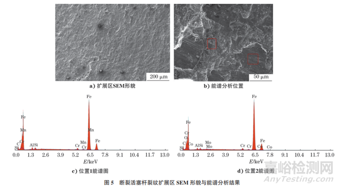 在裂紋擴展區(qū)截取試樣,將試樣置于掃描電子顯微鏡下觀察,并對其進行能譜分析,結(jié)果如圖5所示。