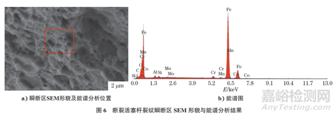 圖6為斷裂活塞桿裂紋瞬斷區(qū)SEM 形貌與能譜分析結(jié)果。由圖6可知:瞬斷區(qū)呈準解理和撕裂形貌;斷口上主要成分也為金屬和金屬氧化物,無其他腐蝕產(chǎn)物。