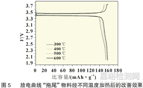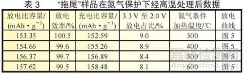 取已形成放電曲線“拖尾”的磷酸鐵鋰樣品(3.3V至2.0V放電占比11.8%),分別在氮氣隔絕空氣條件下經(jīng)以下溫度進行加熱,處理完成后進行半電池測試,如表3及圖5所示。