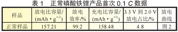 將正常磷酸鐵鋰樣品制作為半電池后,首次0.1C充放電數(shù)據(jù)如表1所示。
