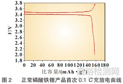 如以上數(shù)據(jù)所示:正常產(chǎn)品半電池首次0.1C充放電數(shù)據(jù)良好,首次放電比容量達(dá)157.21mAh/g,3.3V到2.0V放電容量占總?cè)萘勘壤齼H為4.8%,如表1所示,放電曲線平滑,如圖2所示。