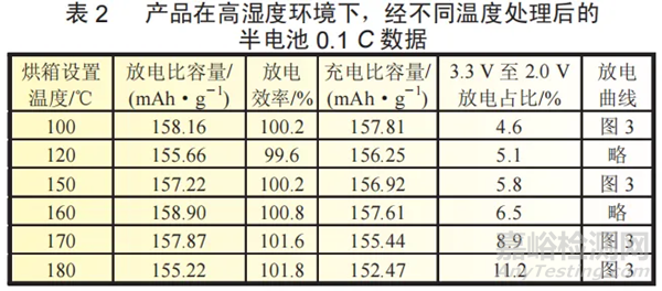 將2.2節(jié)中磷酸鐵鋰樣品分別在烘箱內(nèi)經(jīng)過不同溫度加熱,并在加熱過程中通過加濕器往烘箱通入水汽,將處理后樣品進行扣式半電池測試,得到數(shù)據(jù)如表2所示。