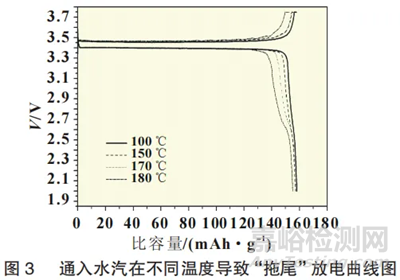 (1)參比實驗:選取一批次磷酸鐵鋰,將其分為10份各50g;選取其中一份進行常規(guī)半電池測試,作為正常參比組;(2)高溫高濕度處理實驗:選取6份上述已分為50g的樣品,分別在烘箱以100、120、150、160、170、180℃不同溫度進行加熱。加熱過程中,通過加濕器向烘箱內(nèi)鼓入水汽,恒溫時間12h。樣品處理完成后,按照扣式電池流程,再次以120℃真空烘干樣品,組裝半電池。在扣式電池充放電機上進行電性能測試。