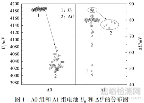 從圖1可知,A0組和A1組電池的U0和ΔU存在明顯的區(qū)別,前者的U0普遍相對較高,而ΔU明顯小于A1組。參照A0組正常電池的U0和ΔU數(shù)據(jù),當(dāng)電池U0<4.18V時,判定為化成電壓不良;當(dāng)電池ΔU>70.0mV時,則判定為自放電不良。