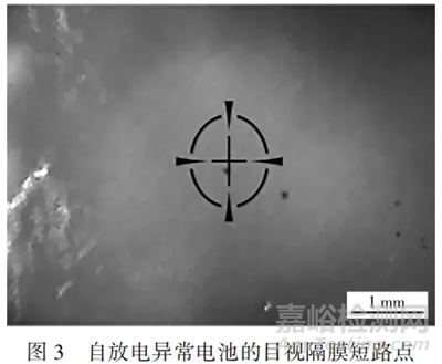 對自放電異常電池,在相對濕度(RH)小于2%的環(huán)境下剝?nèi)ヤ摎ず蜕w帽,緩慢打開卷芯,分離正極、負(fù)極和隔膜,并通過目視方式找到導(dǎo)致自放電異常的隔膜短路點(diǎn),然后用X射線電子能譜儀對隔膜短路點(diǎn)進(jìn)行元素分析。