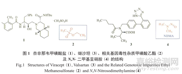 無獨有偶,2018年7月14日,華海制藥生產(chǎn)的高血壓用藥纈沙坦(valsartan,3)由于檢測出含有微量(含量大于0.3×10-6,即0.3ppm)的基因毒性雜質(zhì)N, N-二甲基亞硝胺(NDMA,4),3及其相關(guān)制劑也被宣布從歐洲、美國和中國市場上召回 (化合物結(jié)構(gòu)見圖1)。