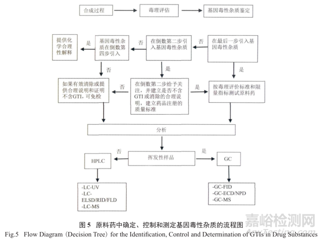 圖5是在原料藥中確定、控制和測定基因毒性雜質(zhì)的流程圖(或稱之為決策樹)。從圖中不難發(fā)現(xiàn)該流程涉及到整個合成過程,尤其是下游的工藝化學,而且和毒理的評估、基因毒性雜質(zhì)的鑒定和過程的控制方案,以及分析方法的選擇和使用緊密相關(guān),是一個復雜細致和邏輯分析的過程。