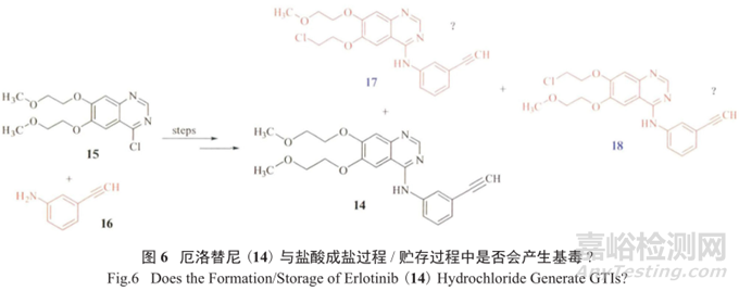 厄洛替尼在成為鹽酸鹽的過程中是否會產(chǎn)生基因毒性雜質(zhì)17和18,以及鹽酸厄洛替尼在貯存過程中會不會降解產(chǎn)生17和18,都是值得關(guān)注的(圖6)。