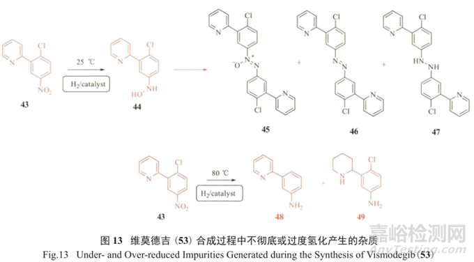 羅氏制藥在抗腫瘤藥維莫德吉 (vismodegib,53) 研發(fā)合成工藝過程中,發(fā)現(xiàn)存在主要潛在基因毒性雜質(zhì)50 ;同時在經(jīng)氫化反應制備關(guān)鍵中間體52的過程中,發(fā)現(xiàn)不徹底或過度的氫化都會帶來具有警示結(jié)構(gòu)的新雜質(zhì)羥胺44和芳香胺48、49(圖13),給質(zhì)量控制帶來了不小的挑戰(zhàn)。