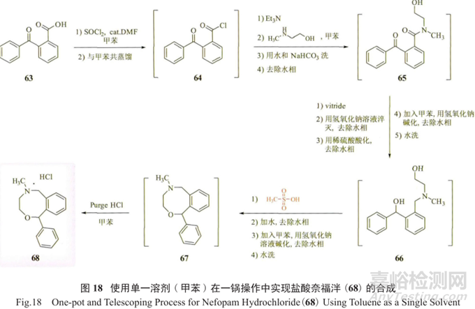 最近,有文獻報道了一種新型非麻醉性鎮(zhèn)痛藥鹽酸奈福泮(68)的公斤級合成工藝(圖 18)。