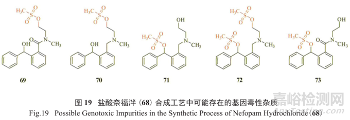 文獻稱該工藝能夠合理地避免基因毒性雜質(zhì)的形成。但從最終純化68時采用了甲醇的情況以及甲磺酸的使用來看,若有潛在的基因毒性雜質(zhì)69~73(圖19)的形成,則經(jīng)酯交換反應,極有可能帶來甲磺酸酯這樣的GTI(注 :該文獻作者發(fā)現(xiàn)未知雜質(zhì)經(jīng)甲醇、乙醇或甲醇/水純化處理后的含量在0.01%~0.2%之間)。
