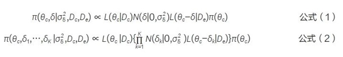 Pocock 方法[2] 引入服從正態(tài)分布N(0,σ2δ) 的隨機變量δ=θc-θe,用 σ2δ衡量研究間可能的異質(zhì)性程度?;贐ayes 理論可得到θc 的后驗分布,見公式(1)。其中,π(θc) 為模型參數(shù)的無信息先驗;L(θc|Dc) 是當前對照組數(shù)據(jù)的似然函數(shù);L(θc-δ|De)是考慮隨機變量δ 的外部對照數(shù)據(jù)的似然函數(shù)。若存在K 個滿足要求的外部對照數(shù)據(jù),分別用D1,D2,…, DK表示,即De=(D1,…,DK),則后驗分布見公式(2)。即允許不同外部對照數(shù)據(jù)的異質(zhì)性偏倚δk 不同。由于難以通過外部對照來精確估算σ2δ,該方法建議為σδ預(yù)先設(shè)定一個值,并基于不同的σδ 值進行敏感性分析。