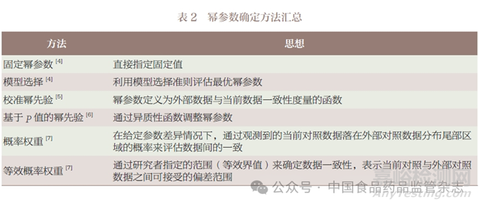 Viele 等[43] 提出了一種基于“先檢驗后合并(test-thenpool)”策略的頻率學(xué)派方法,首先對內(nèi)外部數(shù)據(jù)進行假設(shè)檢驗以評估是否存在統(tǒng)計學(xué)上的顯著差異。如果差異不顯著,則合并數(shù)據(jù)進行最終分析;如果差異顯著,則僅使用當前研究數(shù)據(jù)。改進的“ 基于等效的先檢驗后合并(equivalence-based test-then-pool)”方法[44] 則通過等效性檢驗進行評估,不僅可檢驗內(nèi)外部數(shù)據(jù)間是否存在差異,還考察這些差異是否小于預(yù)先設(shè)定的等效性邊界。