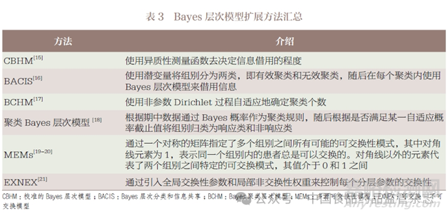 Bayes 層次模型(Bayesian hierarchical model,BHM)[14]通常假設(shè)不同研究中的感興趣參數(shù)均源自同一個正態(tài)分布,利用其方差τ 反映研究間的異質(zhì)性,從而控制外部數(shù)據(jù)的借用程度。τ值越大表示異質(zhì)性越大,從而借用的信息越少。在此基礎(chǔ)上也有各種擴展方法(表3)。