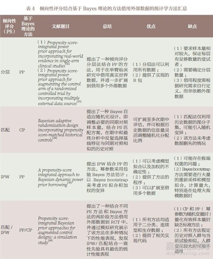 將傾向性評分(propensity score,PS)方法和基于Bayes理論的方法相結(jié)合,一方面,先利用PS 方法均衡內(nèi)外部數(shù)據(jù)間的基線差異,減少基線特征差異導(dǎo)致的偏倚;另一方面,通過基于Bayes 理論的方法對外部數(shù)據(jù)借用程度進行打折。表4 簡要匯總了近年已發(fā)表的PS 結(jié)合基于Bayes 理論的方法借用外部數(shù)據(jù)的文獻,并針對各文獻的研究方法和優(yōu)缺點進行了討論說明。