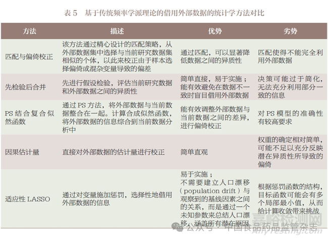 基于傳統(tǒng)頻率學(xué)派理論的方法主要包括匹配與偏倚校正、先檢驗后合并、PS 結(jié)合復(fù)合似然函數(shù)方法、因果估計量方法以及適應(yīng)性LASSO 方法5 種方法。表5 匯總了基于傳統(tǒng)頻率學(xué)派理論方法的優(yōu)缺點以及主要思想。