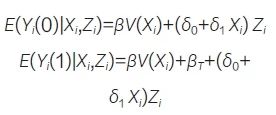 其中Yi(1) 和Yi(0) 分別表示當前研究個體i接受治療和不接受治療下的“潛在結(jié)局”,V(Xi) 是一個未知但單調(diào)的協(xié)變量函數(shù),δ0 和δ1 是代表不同研究數(shù)據(jù)差異的參數(shù),可以是常數(shù)或協(xié)變量的函數(shù), βT 是待估參數(shù)。該方法的具體步驟如下:首先,基于PS進行匹配,先對當前研究的對照組及試驗組進行匹配;然后,將當前研究試驗組未成功匹配的個體與外部對照數(shù)據(jù)進行匹配;最后,再將當前對照數(shù)據(jù)與外部對照數(shù)據(jù)進行匹配。完成上述步驟后,對當前對照組與外部對照組匹配的數(shù)據(jù)擬合最小二乘法模型: