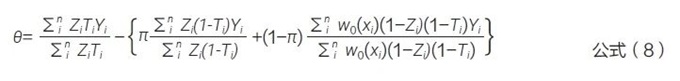 Guo 等[47] 提出的因果估計量方法是通過自適應(yīng)權(quán)重因子π 的形式, 動態(tài)地融合外部對照數(shù)據(jù)和當前試驗數(shù)據(jù),見公式(8)。其中,n 為總樣本量,即n=Nt+Nc+Ne; π 是平衡當前對照和外部對照信息的權(quán)重,取值為當前對照樣本量占當前與外部有效樣本量(effective sample size)之和的占比;w0 (xi) 是考慮內(nèi)外部數(shù)據(jù)基線分布不均衡后的權(quán)重。