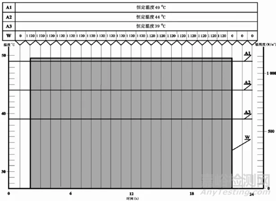 √ 程序1(循環(huán)試驗)包含三種高溫日循環(huán)試驗,一個是1120w/m2和49℃,一個是1120w/m2和44℃,一個是1120w/m2和39℃。