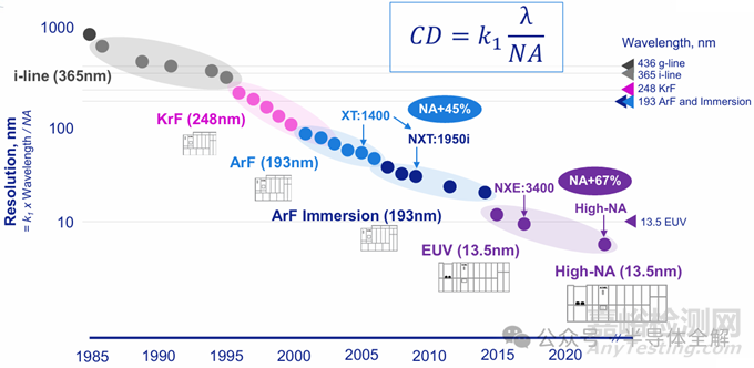 光刻機分辨率的持續(xù)提高,是推動半導體集成電路的發(fā)展按照摩爾定律發(fā)展的關(guān)鍵,因此研發(fā)更高分辨率的光刻機,成為各光刻機供應(yīng)商持續(xù)的追求。光刻機分辨率和工作波長和系統(tǒng)的數(shù)值孔徑確定: