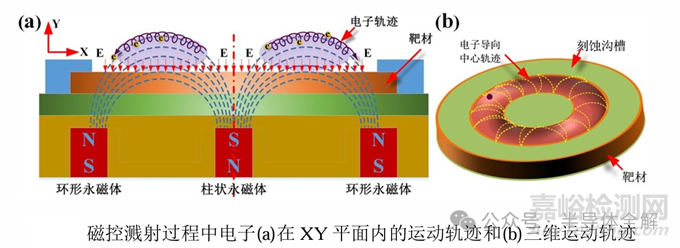 靶材表面磁場對二次電子的束縛作用顯著提高了靶面附近等離子體濃度,從而有效解決了普通二極濺射沉積速率低的問題。因此,電子在靶面磁場的束縛作用下的運動過程是理解磁控濺射原理的關(guān)鍵。下圖展示了磁控濺射靶面附近的電場和磁場的分布情況。