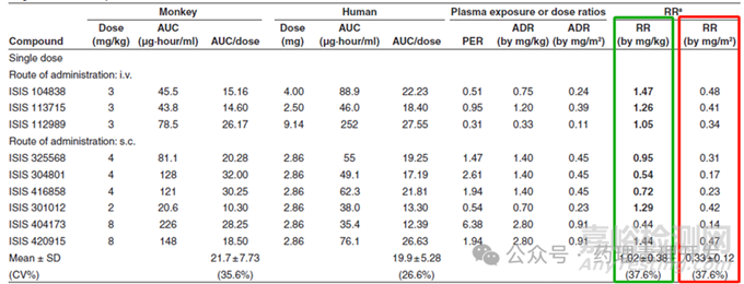 這里就要回答一個(gè)底層問題,小分子細(xì)胞毒類藥物采用BSA,是因?yàn)锽SA與動(dòng)物代謝速率之間相關(guān)性更好。那寡核苷酸類藥物代謝特征與BW或BSA中的哪個(gè)更相關(guān)呢?寡核苷酸類藥物具備獨(dú)特的PK特征,如廣泛的組織分布、相對長的組織半衰期、核酸酶代謝等。Yu及其團(tuán)隊(duì)2015年公布了一項(xiàng)研究結(jié)果,采用小鼠、食蟹猴單次或多次,經(jīng)皮下或靜脈給予9個(gè)ASO藥物,考察了BW、BSA與暴露量AUC的相關(guān)性。結(jié)果發(fā)現(xiàn),基于BW計(jì)算,食蟹猴的暴露量與劑量的比例,在人體的2倍以內(nèi),具體見下表。小鼠則比人體低5倍。故,基于食蟹猴的劑量進(jìn)行人體HED計(jì)算,可以采用BW,按照1:1種屬間換算。如果基于小鼠劑量換算,則需要一個(gè)5-11倍的縮放系數(shù)。無獨(dú)有偶,Nanavati及其團(tuán)隊(duì)2021年發(fā)現(xiàn)了類似情況,GalNAc偶聯(lián)的ASO由于肝臟攝取和分布,具備較高的血漿清除率,基于BW的1:1縮放進(jìn)行非人靈長類和人體間劑量換算是可靠的。其實(shí),前文所述的FDA 2005年指南中的表述也類似,某些ASO,各種動(dòng)物種屬之間Cmax與mg/kg劑量相關(guān)。