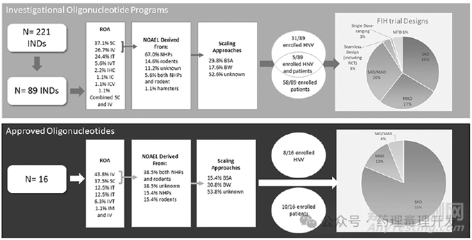 89個(gè)IND中,80個(gè)在臨床方案中披露了NOAEL,估計(jì)有些腫瘤適應(yīng)癥未披露。選擇最敏感種屬的NOAEL(大部分來自非人靈長類),經(jīng)BSA或BW折算人體等效劑量,作為依據(jù)之一。另外,75%的寡核苷酸類藥物同時(shí)會(huì)在早期臨床進(jìn)行target engagement或藥效學(xué)測試,以輔助進(jìn)行劑量選擇。FDA披露了此次數(shù)據(jù)統(tǒng)計(jì)和研究的示意圖,如下圖所示。