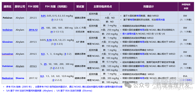鼎泰集團(tuán)的研究團(tuán)隊(duì)前期對已上市的6款siRNA產(chǎn)品做過系統(tǒng)的總結(jié)和梳理,筆者經(jīng)得鼎泰集團(tuán)朋友的允許,借花獻(xiàn)佛,公開如下,在此表示感謝。6款已上市siRNA產(chǎn)品名稱、爬坡劑量、主要非臨床終點(diǎn)、臨床劑量設(shè)計(jì)思路等如下表所示。5款A(yù)lnylam的siRNA藥物均是基于BW外推,1款Dicema公司的產(chǎn)品基于BSA外推,大部分產(chǎn)品是采用猴藥效試驗(yàn)結(jié)果進(jìn)行的人體外推。藥理學(xué)終點(diǎn)如藥理學(xué)活性劑量(PAD)也就派上了用場。另外,F(xiàn)DA也指出同類產(chǎn)品的其他寡核苷酸藥物數(shù)據(jù)也可以參考。比如Arrowhead同平臺的三款siRNA產(chǎn)品ARO-ANGPTL3、ARO-HBV、ARO-AAT的首次臨床起始劑量均為35mg/人。