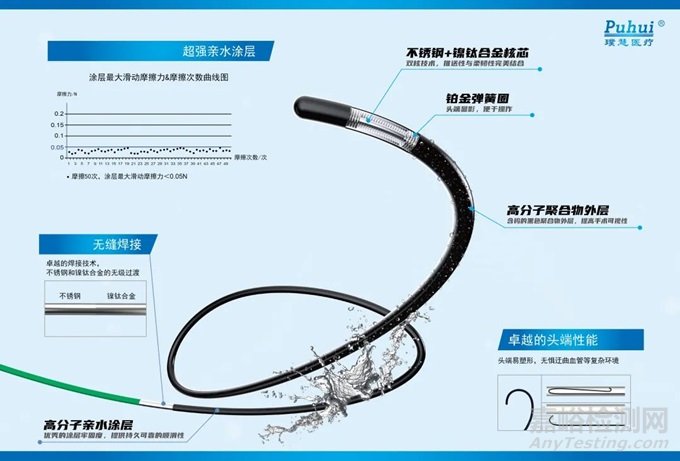 通體不銹鋼芯絲,外層遠(yuǎn)端是 TPU 包覆,近端是PEFE“定制化Accu配方涂層”。親水涂層設(shè)計(jì),增強(qiáng)推送能力,減少與血管的摩擦,易通過。