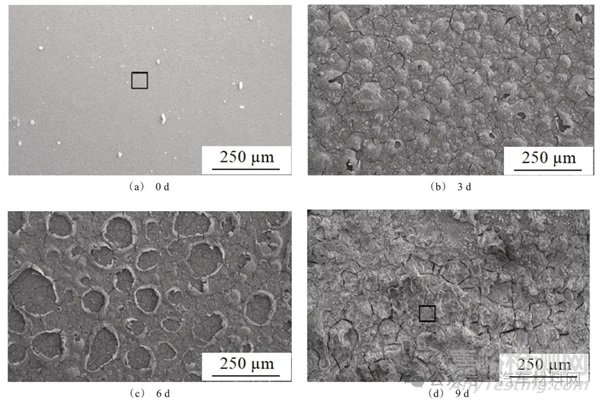 圖1 涂層A試樣在3.5% NaCl溶液中浸泡不同時(shí)間后的顯微形貌