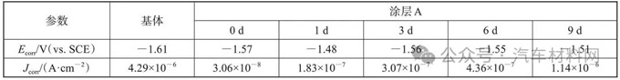 表1 鎂合金基體和浸泡不同時(shí)間后涂層A的電化學(xué)參數(shù)