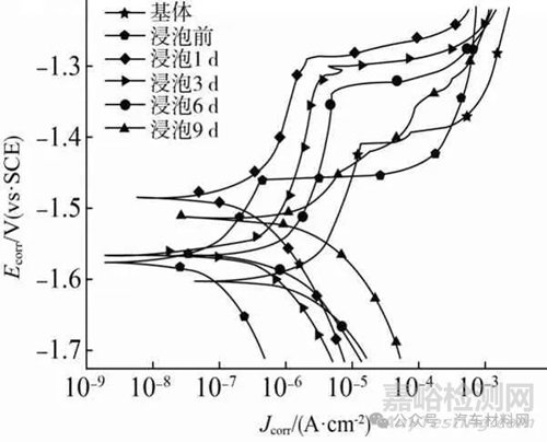 圖5 浸泡不同時(shí)間后鎂合金表面改性涂層的極化曲線