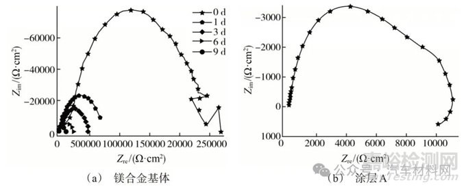 圖3 鎂合金基體和浸泡不同時(shí)間后涂層A的電化學(xué)阻抗譜