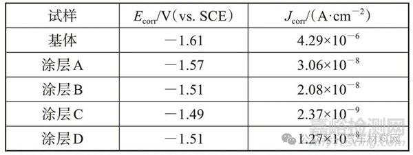 表2 鎂合金基體與涂層試樣的電化學(xué)參數(shù)