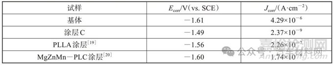 (4)本文制備的涂層C在防腐性能上優(yōu)于文獻(xiàn)報(bào)道的PLLA涂層和MgZnMn-PLC涂層
